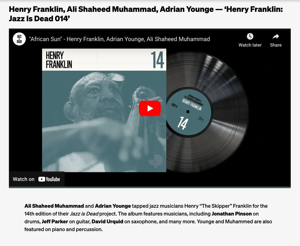 Henry Franklin has been a prolific bassist for over 60 years, performing with a range of artists including Freddie Hubbard, Hampton Hawes, Dexter Gordon, Gene Harris, Doug Carn, Archie Shepp, Willie Bobo, Blue Mitchell, Al Jarreau and Hugh Masekela. With Masekela he appeared at the Monterey International Pop Festival of 1967 and The Harlem Cultural Festival of 1969, which was depicted in the 2021 film, Summer of Soul.